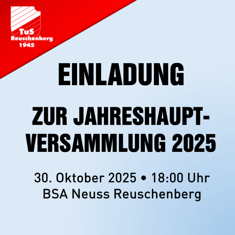 Am Donnerstag, den 30. Oktober 2025 findet um 18.00 Uhr im Sportlerheim, Bezirkssportanlage Reuschenberg, die diesjährige Jahreshauptversammlung der Turn- und Sportgemeinschaft Neuss-Reuschenberg 1945 statt, zu der wir satzungsgemäß alle Mitglieder, bzw. bei minderjährigen Mitgliedern unter 16 Jahren den gesetzlichen Vertreter, recht herzlich einladen.